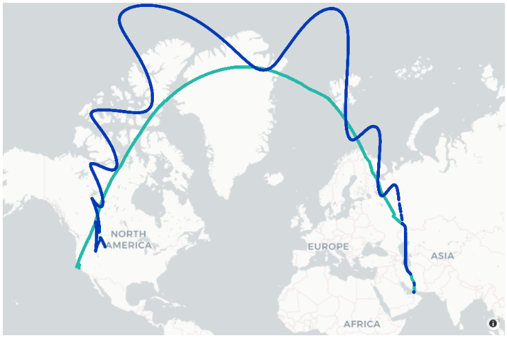 One example of this occurred during a September 2024 flight from Dubai to San Francisco. Early in the route, the AireonVECTOR Flight data perfectly matched the aircraft’s ADS-B data. However, shortly after entering a new airspace, Aireon’s IPC was triggered, and the ADS-B data began to deviate from the AireonVECTOR Flight data.