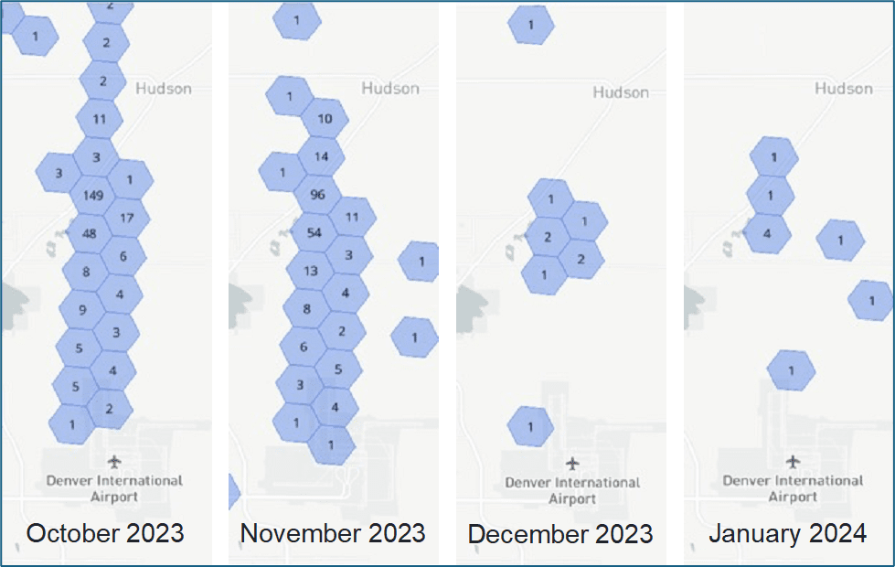 Visually, it is easy to see the dramatic reduction in TCAS-RA events near Denver International Airport following the implementation of the 3° lateral offset approach on Nov. 30, 2023. The October and early November 2023 maps show a high concentration of TCAS-RAs, particularly along the final approach path. However, by December 2023 and January 2024, the number of events dropped significantly, with only a few isolated occurrences remaining.
